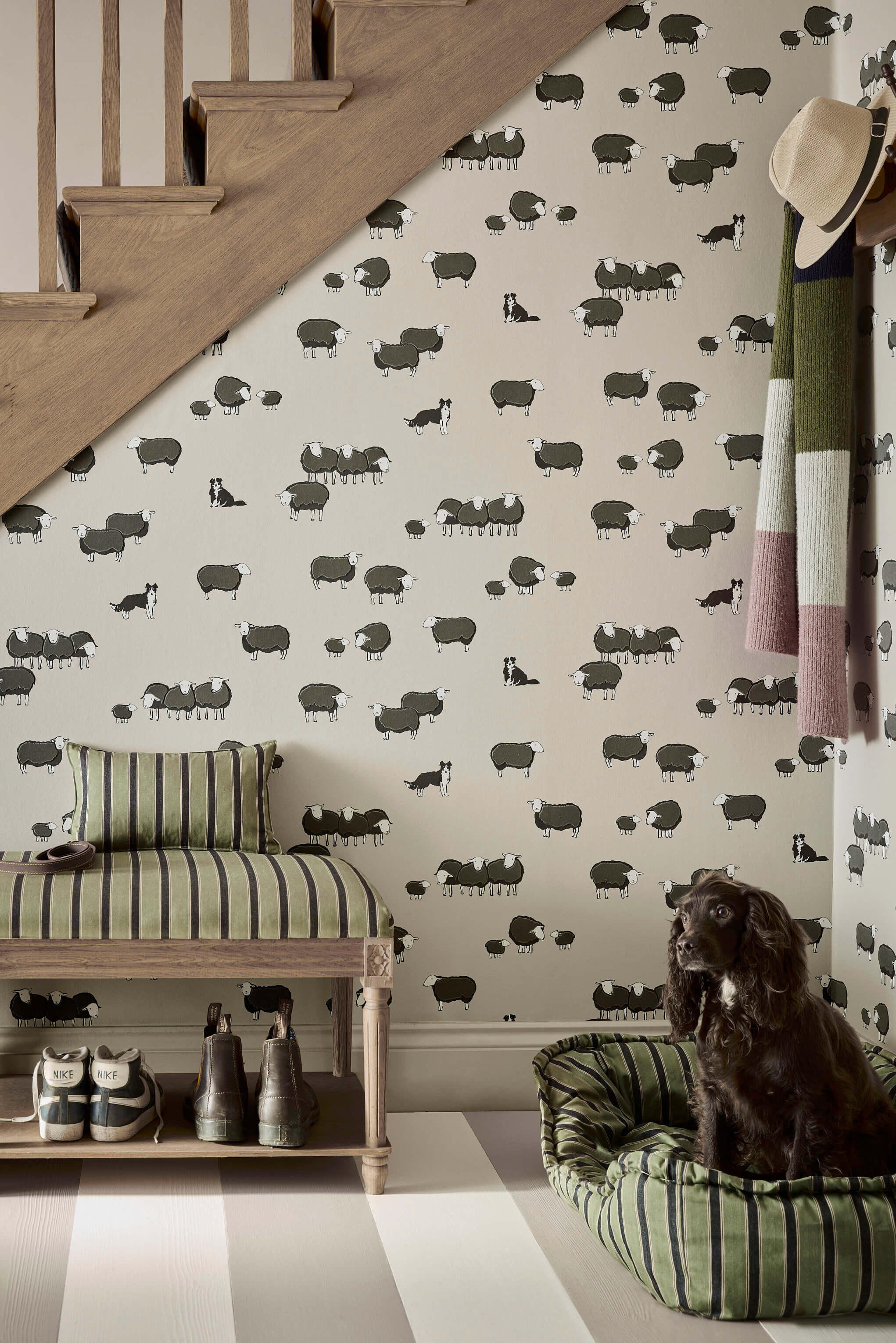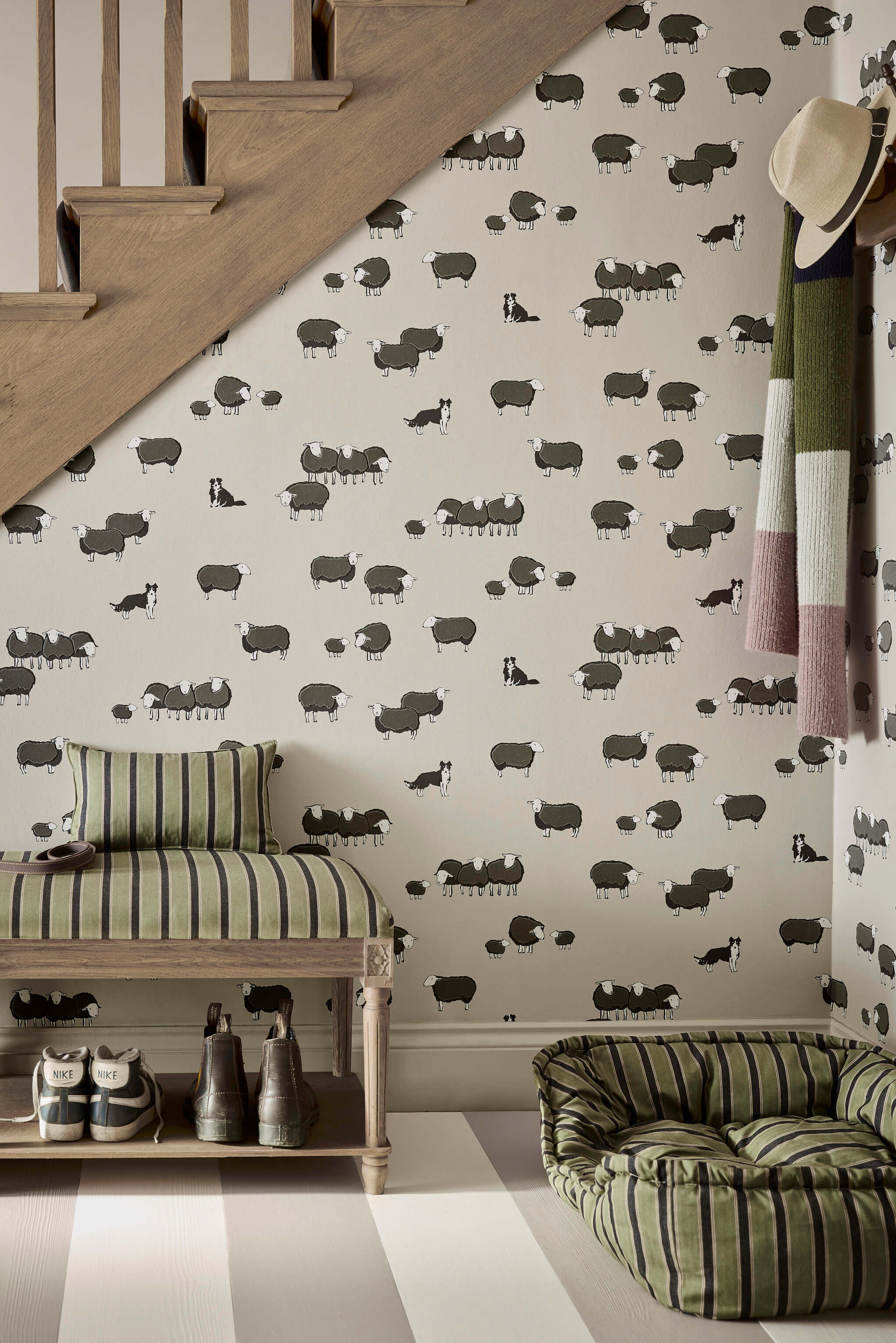 Die Hunde in diesem Design zeigen Beatrix Potters Collies Nip und Lassie. Ihre Originalskizzen wurden in ein fröhliches Tapetendesign umgesetzt, bei dem die dazugehörigen Schafe beflockt wurden, um die Oberfläche zusätzlich zu strukturieren. Beatrix Potter war bekannt für ihr Engagement in der Landwirtschaft und insbesondere für ihre preisgekrönte Herdwick-Schafzucht. Die Rasse ist ein Synonym für ihren geliebten Lake District, von dem sie nach ihrem Tod im Jahr 1943 rund 4000 Hektar dem National Trust vermacht hat.